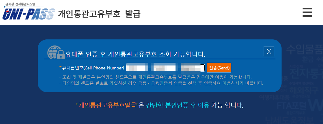 - 2단계: '개인통관고유부호 발급/조회' 메뉴 선택 → 본인 인증 (휴대폰/공동인증서/간편인증)