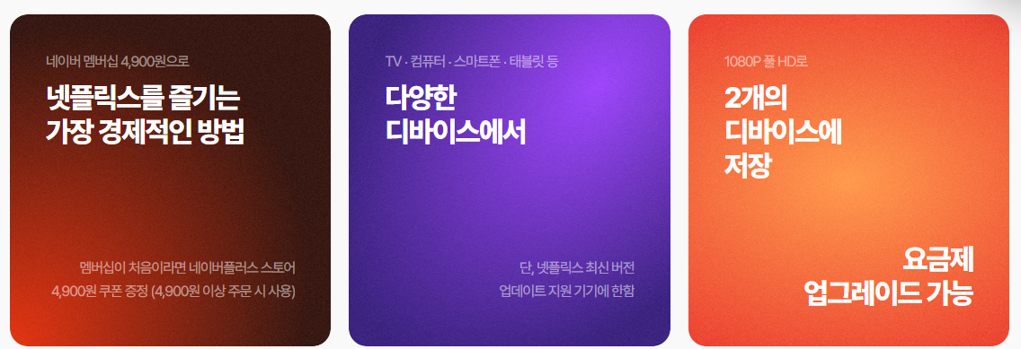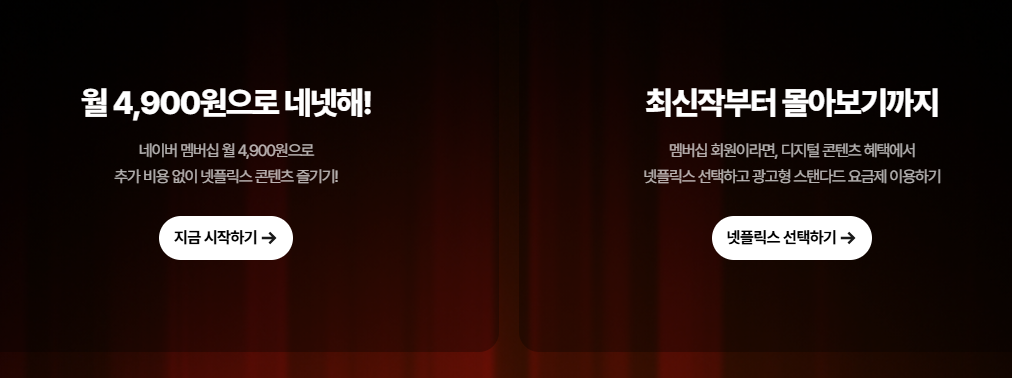 네이버 플러스 멤버십(월 4,900원) 가입 시 넷플릭스 광고형 스탠다드를 무료로 이용할 수 있다. 네이버쇼핑 적립 혜택까지 고려하면 실질적으로 무료 수준이다.