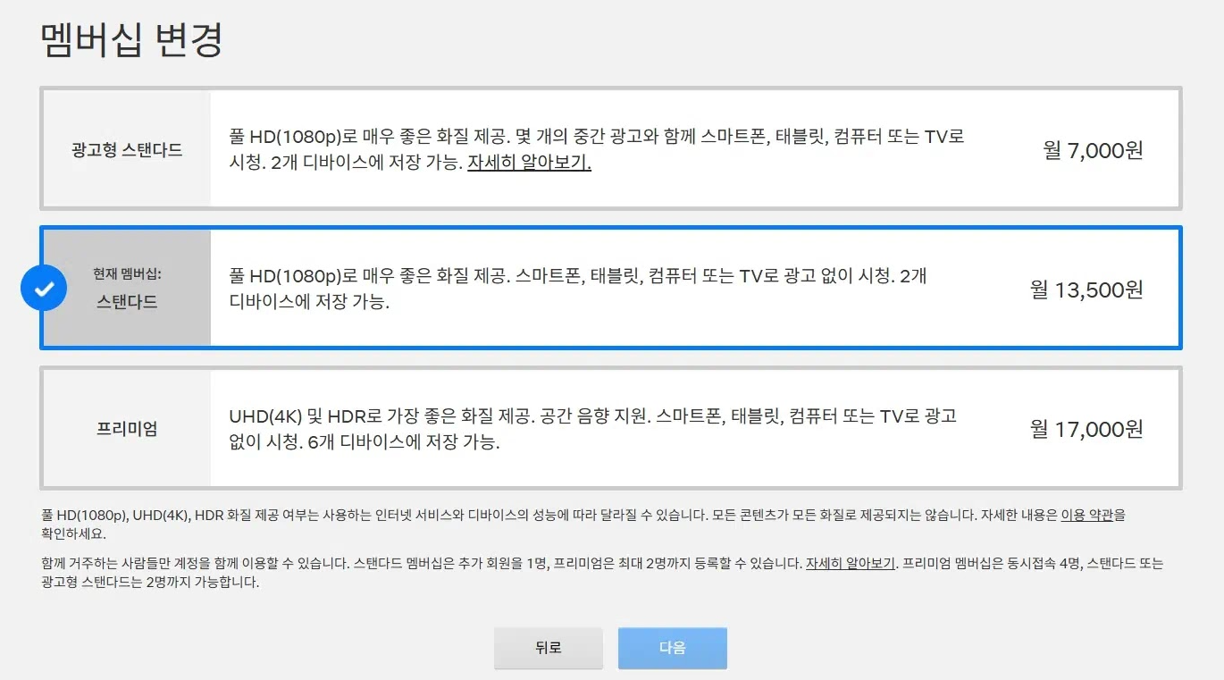 혼자 시청하고 광고가 크게 거슬리지 않는다면 광고형 스탠다드가 가장 경제적이다. 월 7,000원으로 FHD 화질을 즐길 수 있다.