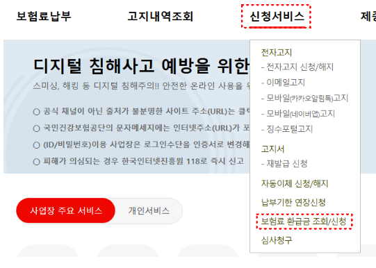 - 국민건보공단 홈페이지 → [민원신청] → [환급금 조회/신청]
