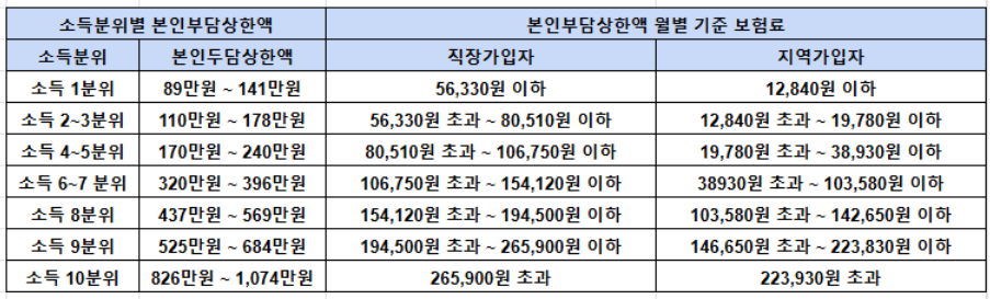 상한액은 개인의 소득에 따라 다르며, 최저 약 89만 원에서 최대 826만 원대까지 차이가 납니다.즉, 의료비가 아무리 많이 나와도 국가가 상한선을 두어 부담을 덜어주는 제도인 셈이죠.