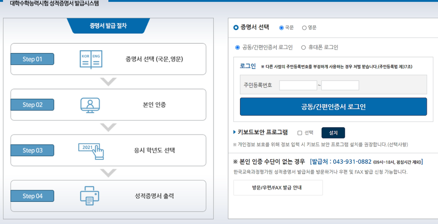 STEP 1: 한국교육과정평가원 성적증명서 발급시스템 접속