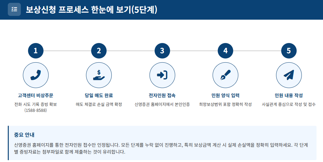 실제 신영증권 보상신청 방법을 단계별로 상세히 안내드리겠습니다. 각 단계를 빠짐없이 진행해야 정상적으로 보상을 받을 수 있습니다.