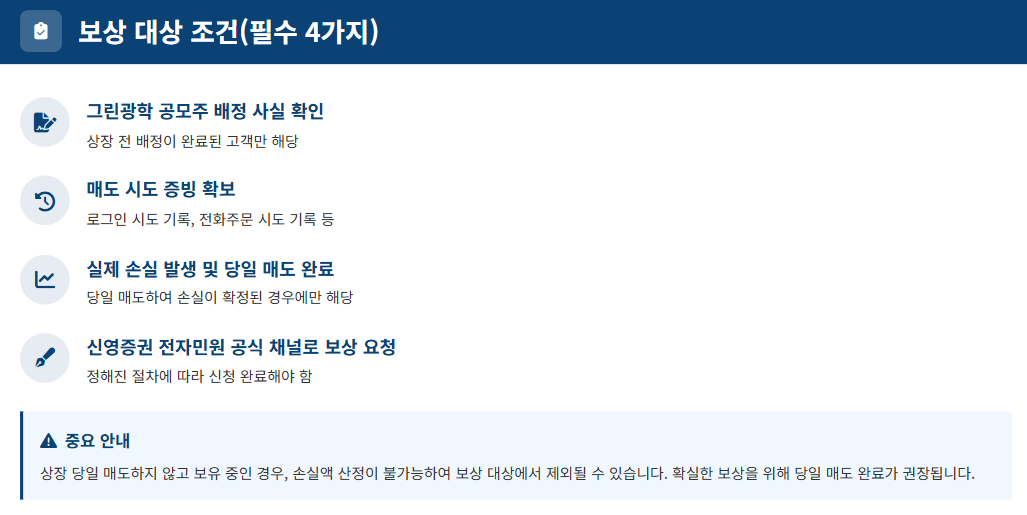 보상을 받기 위해서는 반드시 상장 당일 매도를 완료해야 합니다. 접속이 가능해진 시점에 시장가 또는 지정가로 매도하여 실제 손실액을 확정하세요.
