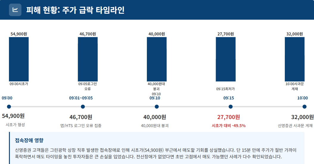 특히 그린광학은 시초가 54,900원에서 시작해 단 몇 분 만에 27,700원까지 급락하면서, 신영증권 접속장애로 인해 매도 타이밍을 놓친 투자자들의 손실이 막대했습니다.