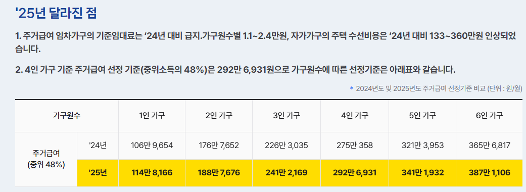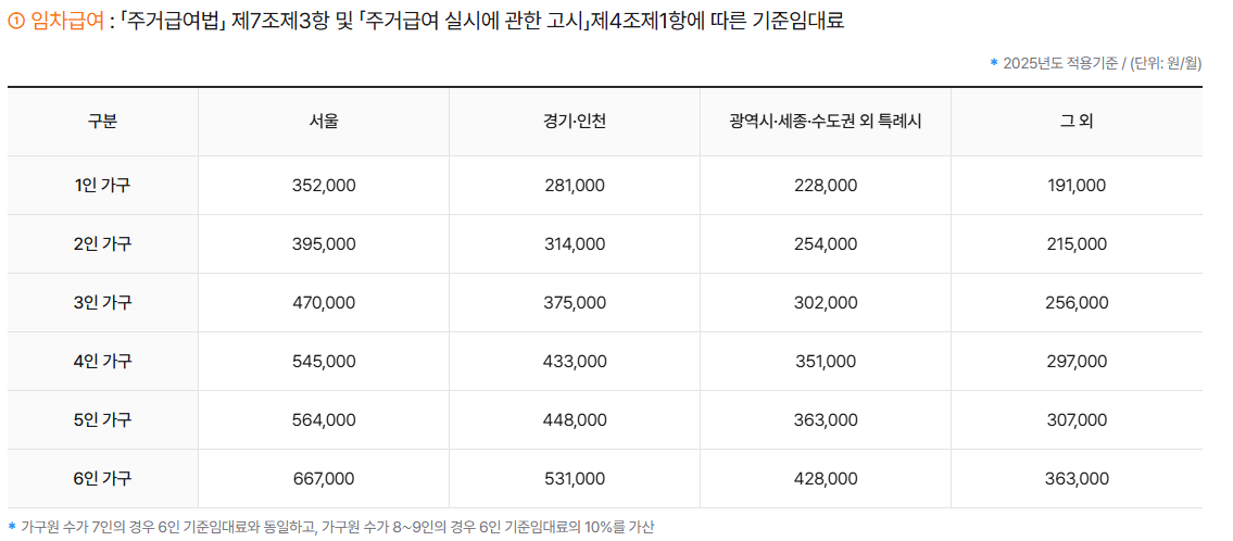 이전에는 부모나 자녀 등 직계가족의 수입도 신청 여부에 영향을 미쳤지만, 2025년 현재는 오직 본인 가구의 소득과 재산만으로 주거급여 신청자격을 판단합니다. 즉, 더 많은 국민이 수급 가능성이 생긴 것이죠.