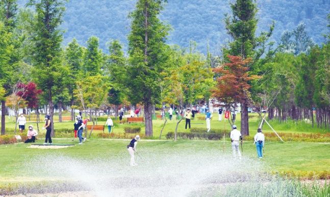 홀의 거리에 따라 파3, 파4, 파5로 구분됩니다. 파3은 40~60m, 파4는 80~100m, 파5는 120~150m 정도이며, 18홀 기준으로 총 66타가 표준 스코어입니다.