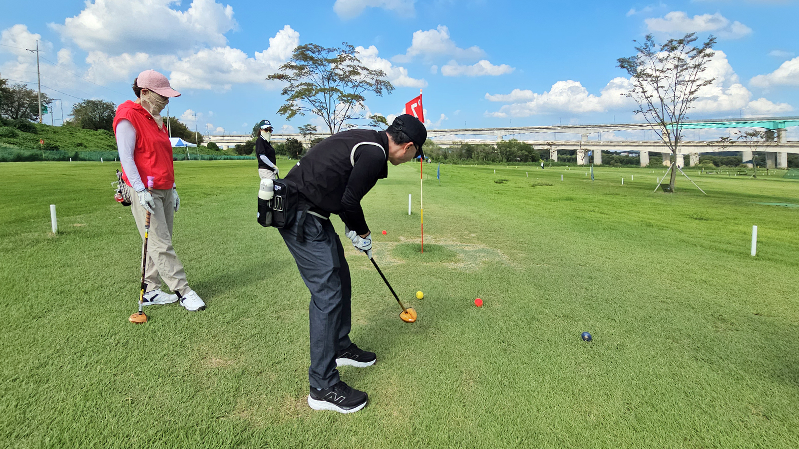 그린에 공을 올리기 위한 샷입니다. 거리 조절과 방향성이 매우 중요한 파크골프 경기규칙 용어입니다. - 퍼팅(Putting)