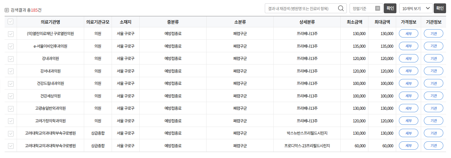 3. 2025년 병원별 폐렴구균 예방접종 비용
