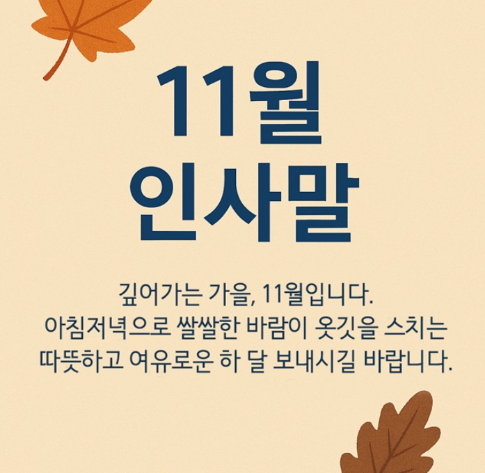 단풍잎이 곱게 물들고 쌀쌀한 바람이 불어오는 11월이 찾아왔어요. 한 해의 끝자락을 향해 달려가는 11월은 감사와 추억을 되돌아보기에 딱 좋은 계절이죠. 이번 달에는 소중한 사람들에게 따뜻한 마음을 전해보는 건 어떨까요? 오늘은 11월의 특성을 담은 11월 인사말 문구, 11월 인사말 이미지를 총정리해서 소개해드릴게요. 늦가을의 정취가 물씬 느껴지는 감성 가득한 인사말들로 마음을 전해보세요!
