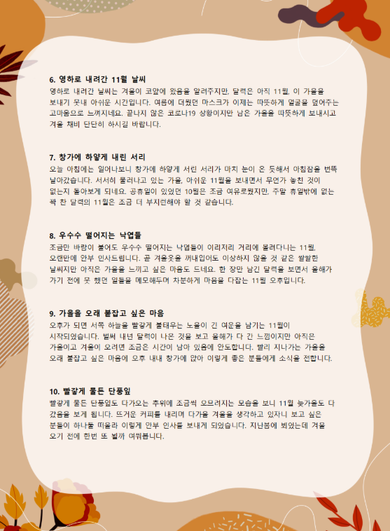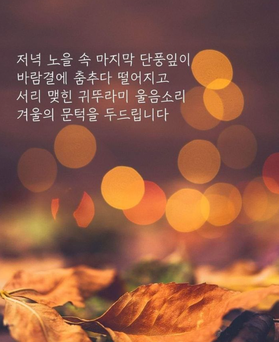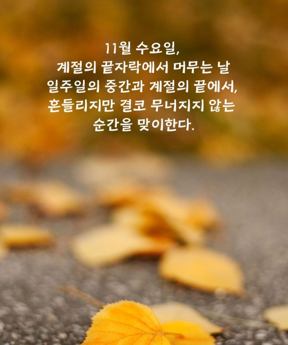 • "가을의 끝자락, 낙엽처럼 편안한 11월 되시길"