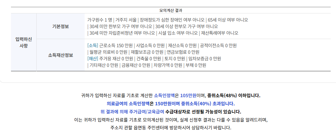 - 생계급여: 기준중위소득 32% 이하 (가장 엄격한 조건)