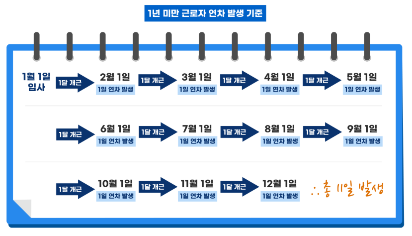 | 1년 미만 | 1개월 개근 시 1일 | 최대 11일 |