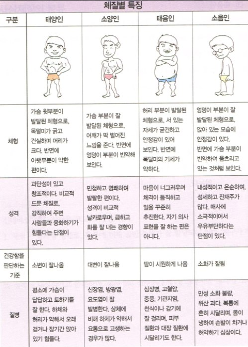- 수음체질: 장이 약하고 피로 누적이 쉬움, 소화에 부담 없는 식사 필요